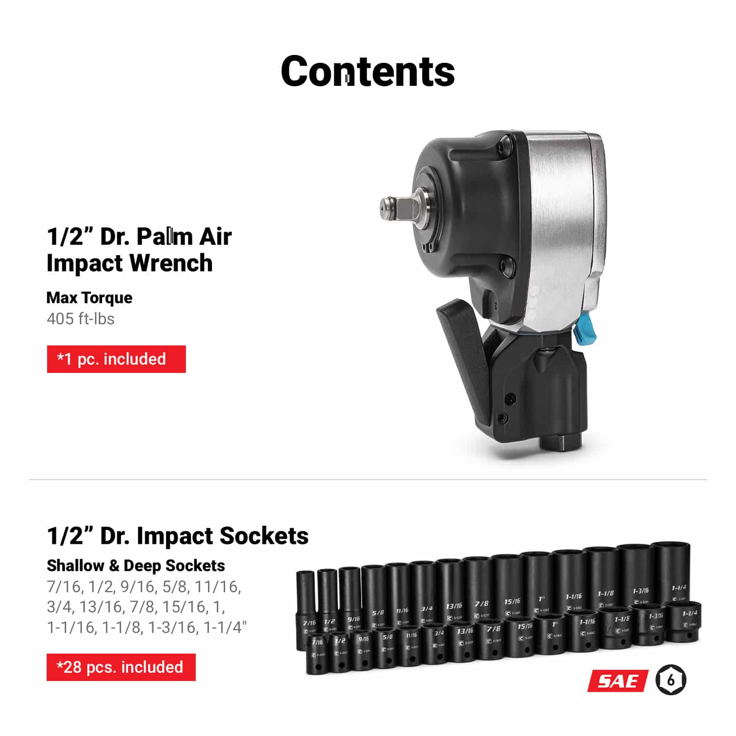 | CP55000-29SIB | 1/2″ Dr. Palm Air Essential Impact Bundle, SAE | 29 |