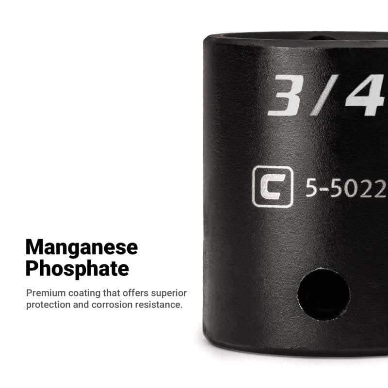 The Capri Tools Impact Socket is a collection of most frequently used shallow impact sockets for trucks and heavy equipment. We use premium Chrome Molybdenum steel tempered with our proprietary heat treatment process to make these deep impact sockets. They are durable and specifically made to withstand high torque from power tools. Each item is expertly coated with manganese phosphate, the preferred coating in military and aerospace, which offers superior protection and corrosion resistance compared to black oxide coating on other shallow impact sockets. The 6-point WaveDrive design grips fasteners more tightly than traditional design, preventing fastener rounding and giving you more leverage. Meets and exceeds ASME B107.110 standards.