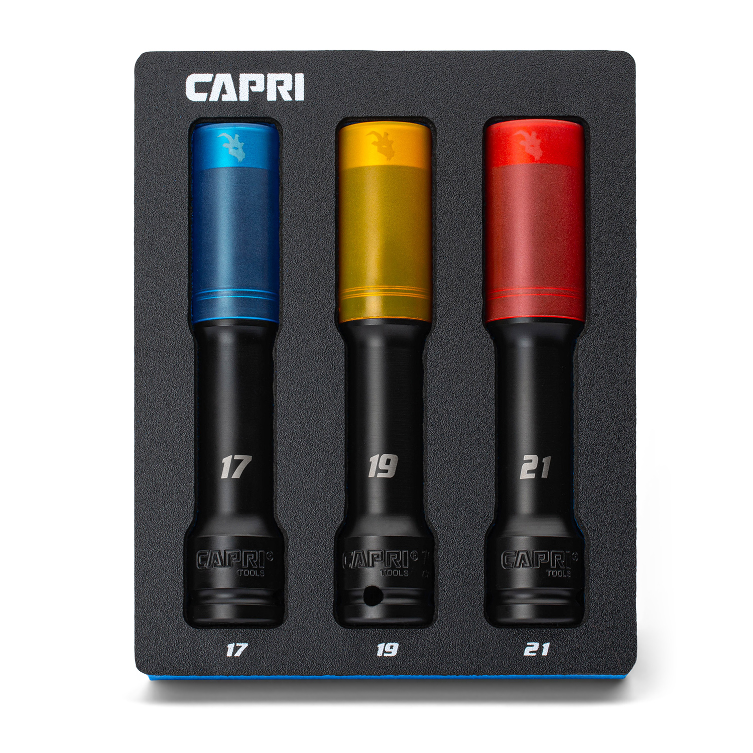 Service modern wheels with confidence using the 1/2″ Drive Extended Wheel Lug Nut Socket Set. Designed with an extended length for easy access to recessed lug nuts, these sockets reach deeper without sacrificing strength or control. The thin-walled construction provides extra clearance in tight wheel openings, helping reduce unwanted contact and minimize the risk of damage. A non-marring protective sleeve shields wheel finishes, while an integrated internal plastic insert adds another layer of protection for both lug nuts and rims during installation and removal. Built from high-strength chrome molybdenum (Cr-Mo) steel, this set is engineered to withstand high torque and repeated impact use. Laser-etched size markings ensure long-lasting readability, and color-coded identification makes it easy to grab the right socket at a glance. Designed with a standard 1/2″ drive, these sockets are compatible with torque wrenches, breaker bars, and impact wrenches for controlled installs or high-torque removal. Comes complete with 17mm, 19mm, and 21mm to cover the most common wheel lug nut sizes. Compact storage tray included.
