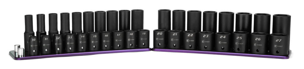 The Capri Tools 3/8 in. Drive Shallow and Deep Impact Socket Set is a collection of most frequently used 3/8 in. drive shallow and deep impact sockets in metric sizes. We use premium Chrome Molybdenum steel tempered with our proprietary heat treatment process to make these impact sockets and accessories. They are durable and specifically made to withstand high torque from power tools. Each item is expertly coated with manganese phosphate, the preferred coating in military and aerospace, which offers superior protection and corrosion resistance compared to black oxide coating on other impact sockets. The 6-point WaveDrive design grips fasteners more tightly than traditional design, preventing fastener rounding and giving you more leverage. Meets and exceeds ASME B107.110 standards. 36-piece set includes (18) 1/2 in. drive deep impact sockets: 10, 11, 12, 13, 14, 15, 16, 17, 18, 19, 20, 21, 22, 23, 24, 25, 26, 27 mm and (18) shallow impact sockets: 10, 11, 12, 13, 14, 15, 16, 17, 18, 19, 20, 21, 22, 23, 24, 25, 26, 27 mm. Comes with a billet aluminum socket rail made by Westling Machine in the USA.