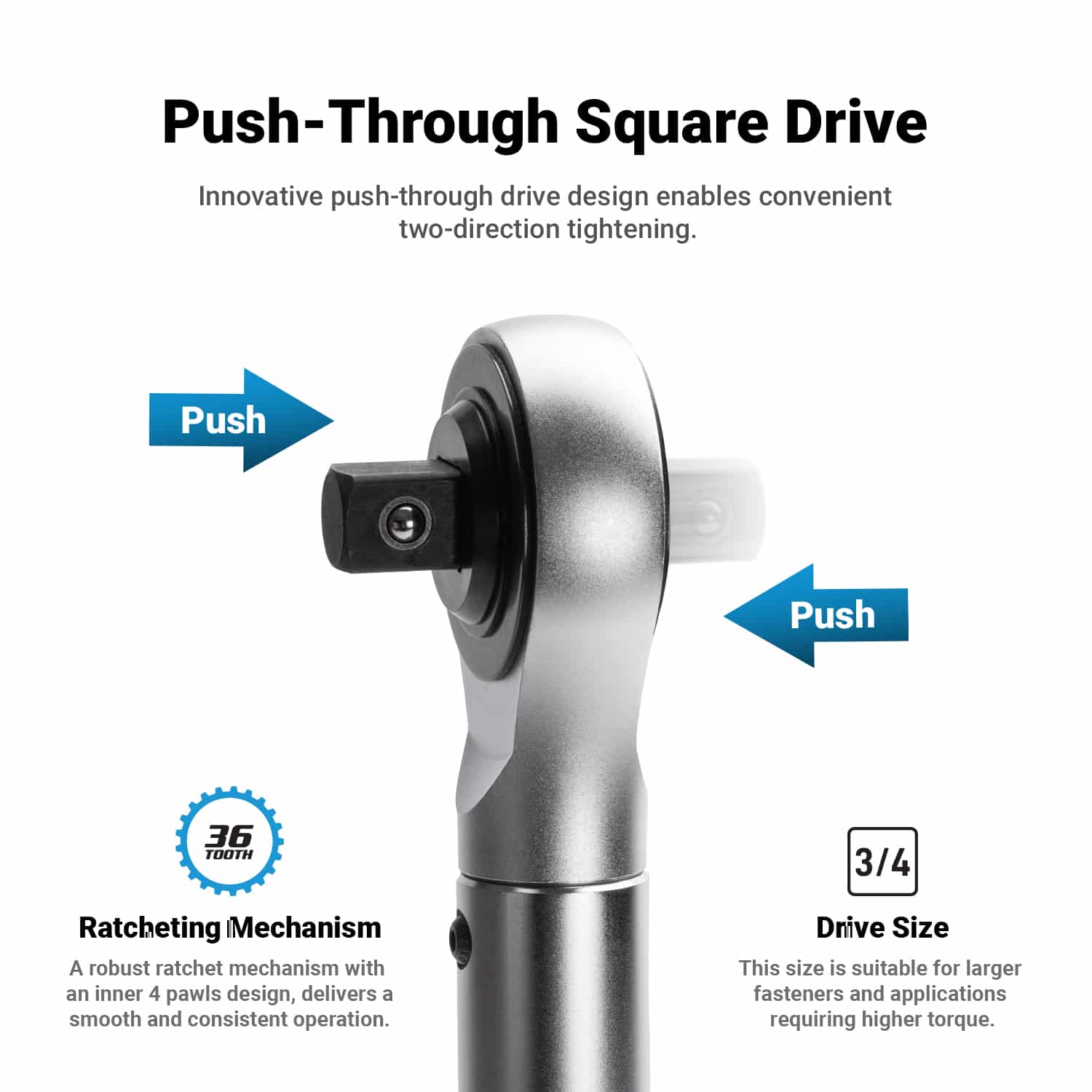 Innovative push-through drive design enables convenient two-direction tightening.