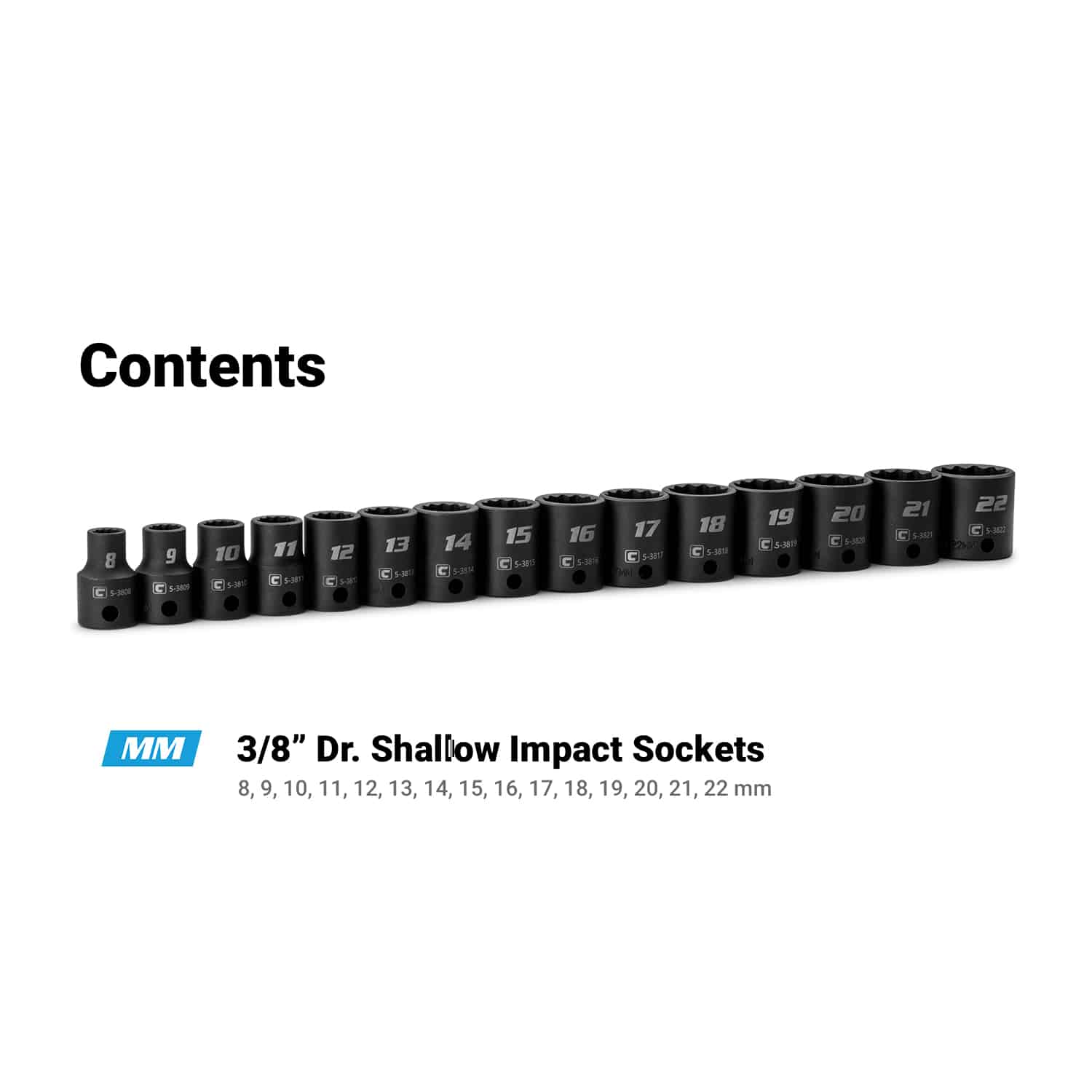 3/8″ Drive 15-Piece 12-Point Shallow Impact Socket Set, 8–22 mm