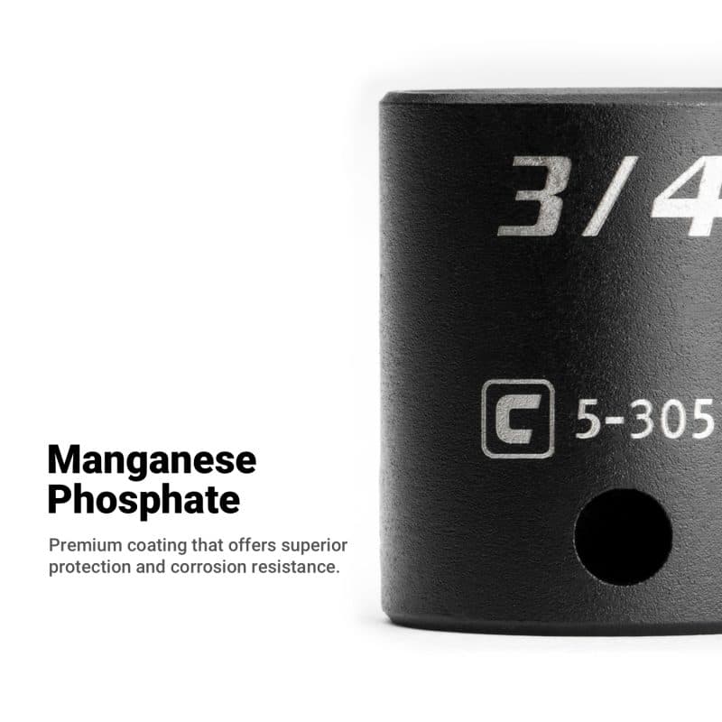 The Capri Tools Impact Socket is a collection of most frequently used shallow impact sockets for trucks and heavy equipment. We use premium Chrome Molybdenum steel tempered with our proprietary heat treatment process to make these deep impact sockets. They are durable and specifically made to withstand high torque from power tools. Each item is expertly coated with manganese phosphate, the preferred coating in military and aerospace, which offers superior protection and corrosion resistance compared to black oxide coating on other shallow impact sockets. The 6-point WaveDrive design grips fasteners more tightly than traditional design, preventing fastener rounding and giving you more leverage. Meets and exceeds ASME B107.110 standards.