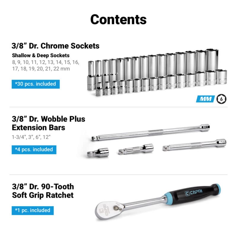 | CP12320-35M-SET | 3/8″ Drive 35-Piece Master 6-Point Chrome Sockets Set + Extensions, Metric | 18 | 6 | 4 | 7.5 |