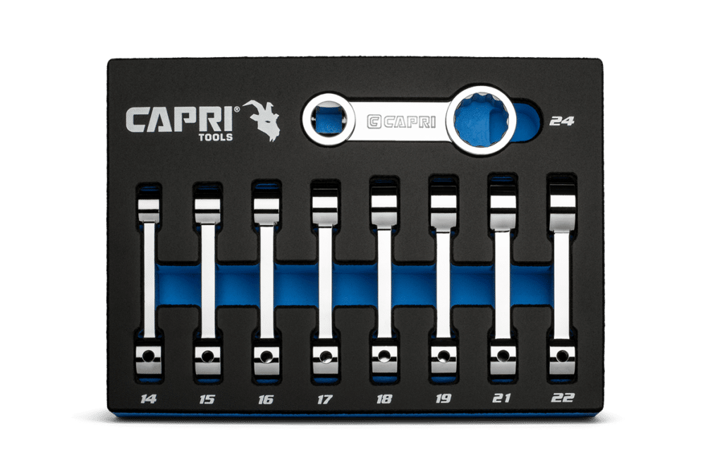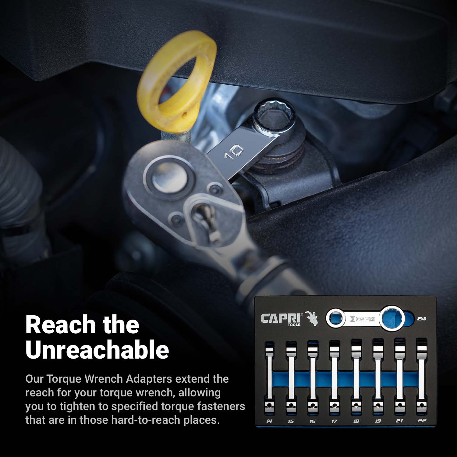 Our new 1/2″ Drive Torque Wrench Adapters Set are engineered to elevate your precision and versatility on the job. Designed to seamlessly integrate with your existing torque wrench, these adapters provide the flexibility to tackle a wide range of fasteners and applications with consistent accuracy. Whether you’re working in tight spaces or need to adapt to different fastener sizes, these adapters are built for durability and ease of use. Crafted from high-quality materials, they ensure a secure fit and reliable performance, making them an indispensable addition to any professional or DIY toolkit. Forged with premium Chrome Vanadium steel with 10-step state of the art heat treatment process. Flawless MaxChrome plating, ensures durability and corrosion resistance. The 12-point WaveDrive design grips fasteners more tightly than traditional design, preventing fastener rounding and giving you more leverage. This set includes the following sizes: 14, 15, 16, 17, 18, 19, 21, 22, 24 mm.Â