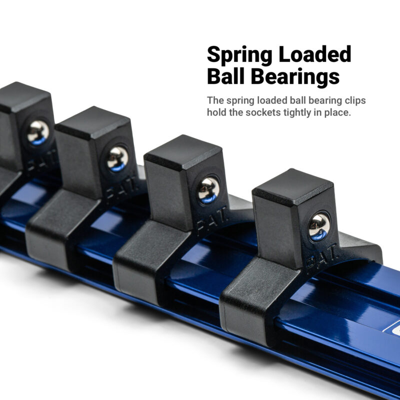 Interchangeable socket clips let you mix and match sizes across different rails for a custom storage setup. Heavy duty spring loaded ball-detent to hold sockets in place.