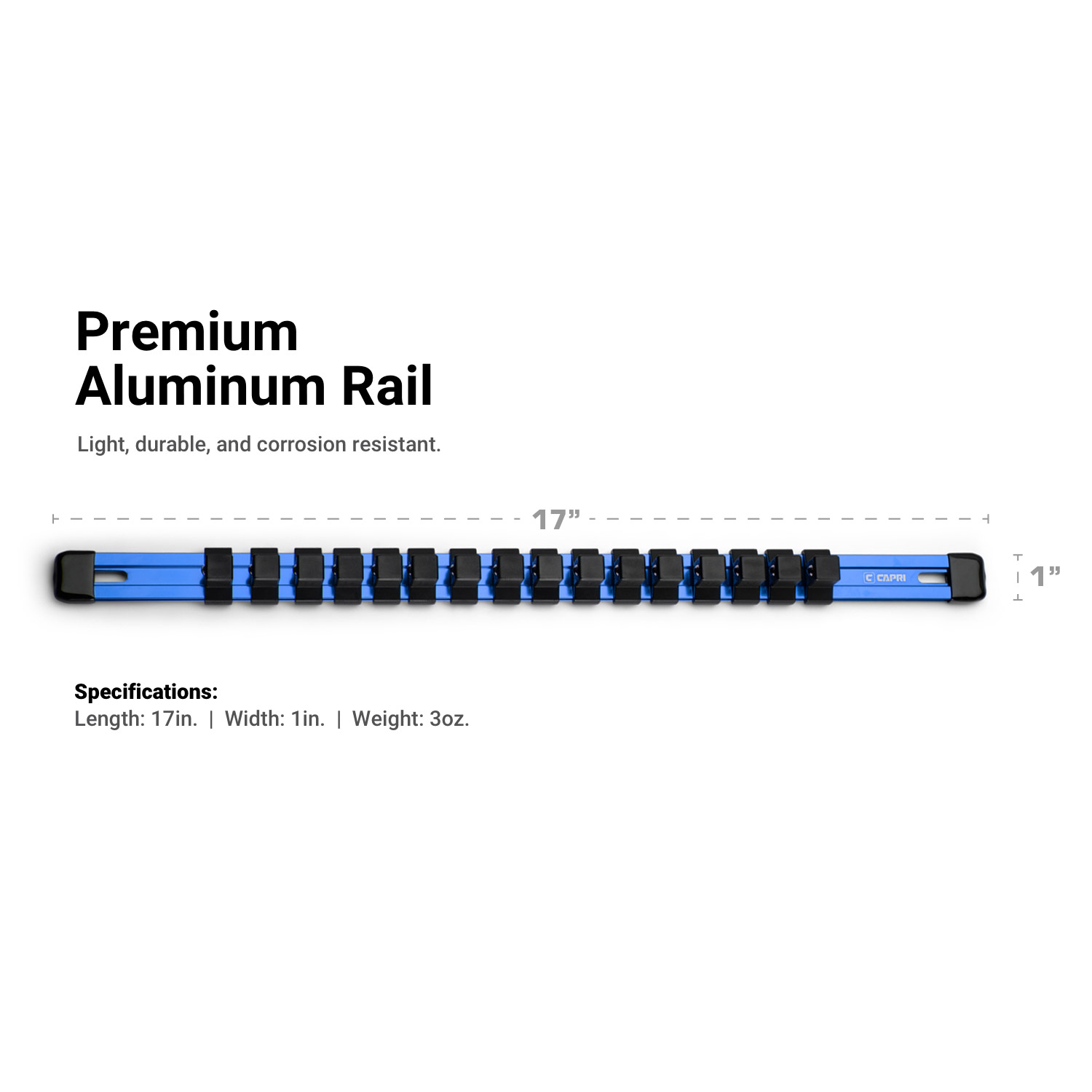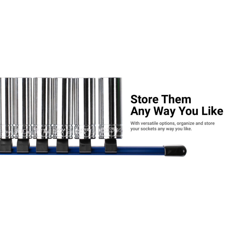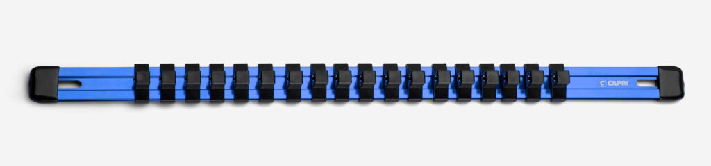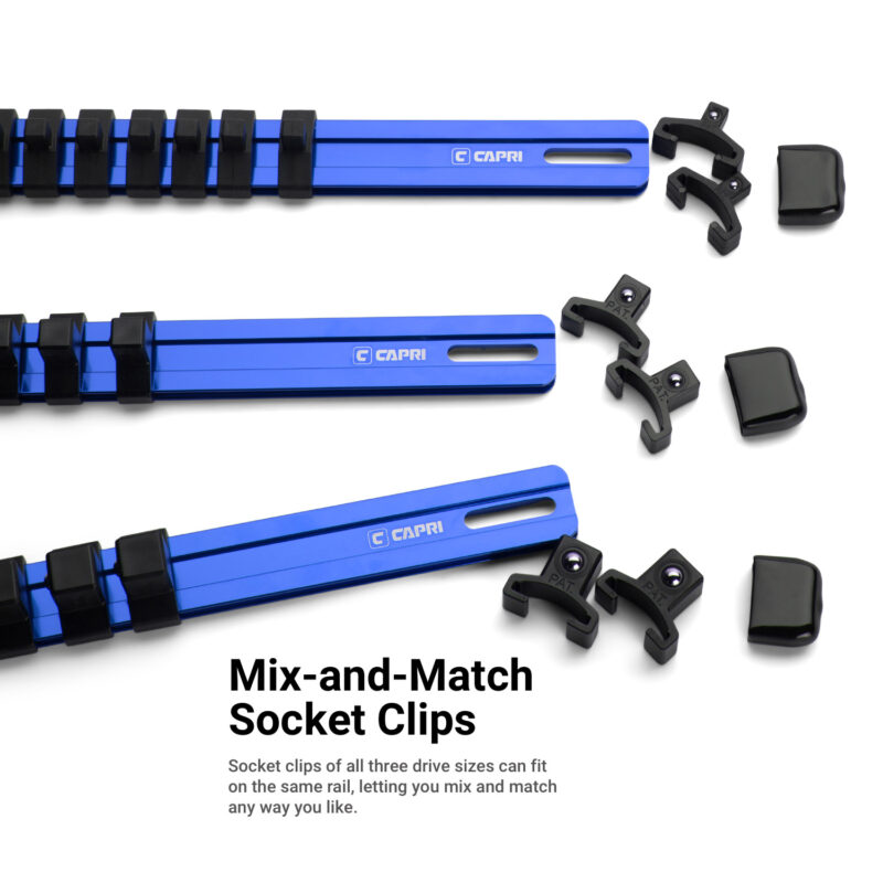 Keep your sockets neatly organized with these versatile Capri Tools Aluminum Socket Rails. Each rail is compatible with all three 1/4″, 3/8″, and 1/2″ drive socket clip sizes, letting you mix and match any way you like. Each socket clip has a spring loaded ball detent which not only holds sockets securely, but also release them easily when you need them. The rail is constructed of premium aluminum which is light, durable and corrosion resistant. The rail comes with open slots on both ends which makes it easy to hang it on your workstation or mount it on the wall.