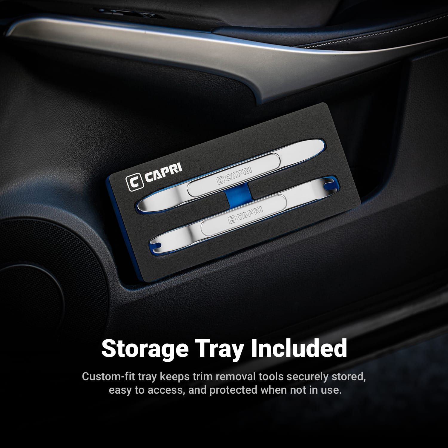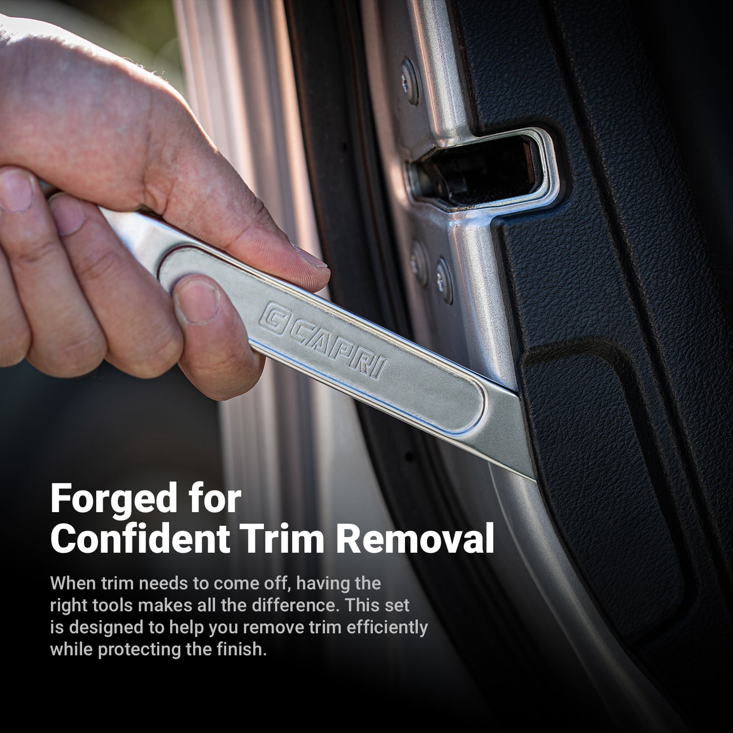The Capri Tools Auto Trim Removal Tool Set is designed to make interior and exterior trim removal easier, cleaner, and more controlled. Built from forged chrome vanadium steel, these tools provide the strength and rigidity needed for extra leverage when removing stubborn panels and clips. Dual-ended designs with four precision-shaped tip profiles offer versatility across a wide range of trim and fastener applications, while slim, low-profile edges help access tight gaps with minimal effort. Durable enough for repeated professional use yet intuitive for DIYers, this set delivers confident trim removal with fewer broken clips and less surface damage. An included storage tray keeps the tools organized and ready for the next job.