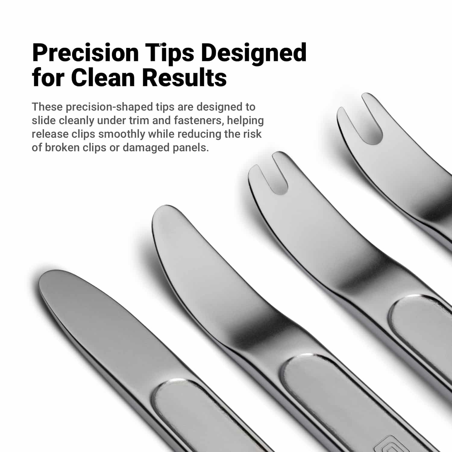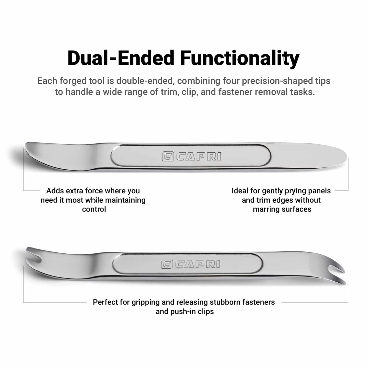Each forged tool is double-ended, combining four precision-shaped tips to handle a wide range of trim, clip, and fastener removal tasks.