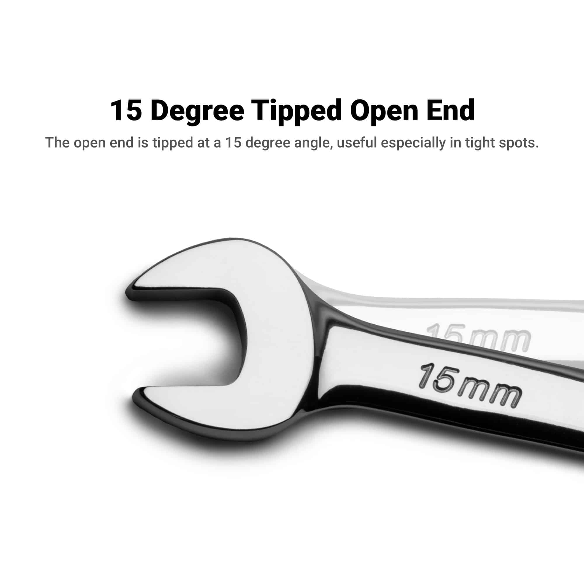 The open end is tipped at a 15 degree angle, useful especially in tight spots.