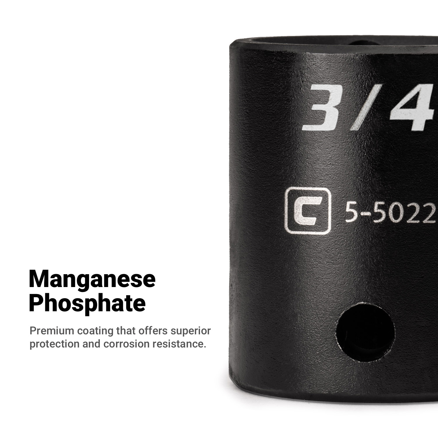 The Capri Tools 1/2 in. Drive Deep Impact Socket Set is a collection of most frequently used 1/2 in. drive deep impact sockets in SAE sizes. We use premium Chrome Molybdenum steel tempered with our proprietary heat treatment process to make these impact sockets and accessories. They are durable and specifically made to withstand high torque from power tools. Each item is expertly coated with manganese phosphate, the preferred coating in military and aerospace, which offers superior protection and corrosion resistance compared to black oxide coating on other impact sockets. The 6-point WaveDrive design grips fasteners more tightly than traditional design, preventing fastener rounding and giving you more leverage. Meets and exceeds ASME B107.110 standards.