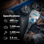 The Capri Tools Palm Air Impact Wrench is a game-changer in the world of power tools. Designed for both professionals and DIY enthusiasts, this compact powerhouse offers unmatched convenience and efficiency in tightening and loosening bolts and nuts in confined spaces. It has an ultra-compact form factor, just 3.34 in. deep and 2.55 in. wide with a compact 5.5″ length. This allows you to easily reach those hidden bolts most impact wrenches can’t go. combines the power of the Ultra-short Twin Hammer and Patented Dual Cylinder Motor. These two cutting-edge technologies to deliver unbeatable performance and efficiency. It packs a 405 ft. lbs. of maximum reverse torque and 333 ft. lbs. of forward torque, twice powerful than other air angle impact wrenches. One hand operation with large forward/reverse thumb dial. It operates quietly at 91.1 dBA and with low air consumption at only 3.4 CFM at 90 PSI. Weighs only 2.42 lbs. Comes with 1/4 in. NPT air inlet. Our Impact Wrenches are backed by a 2 year warranty.