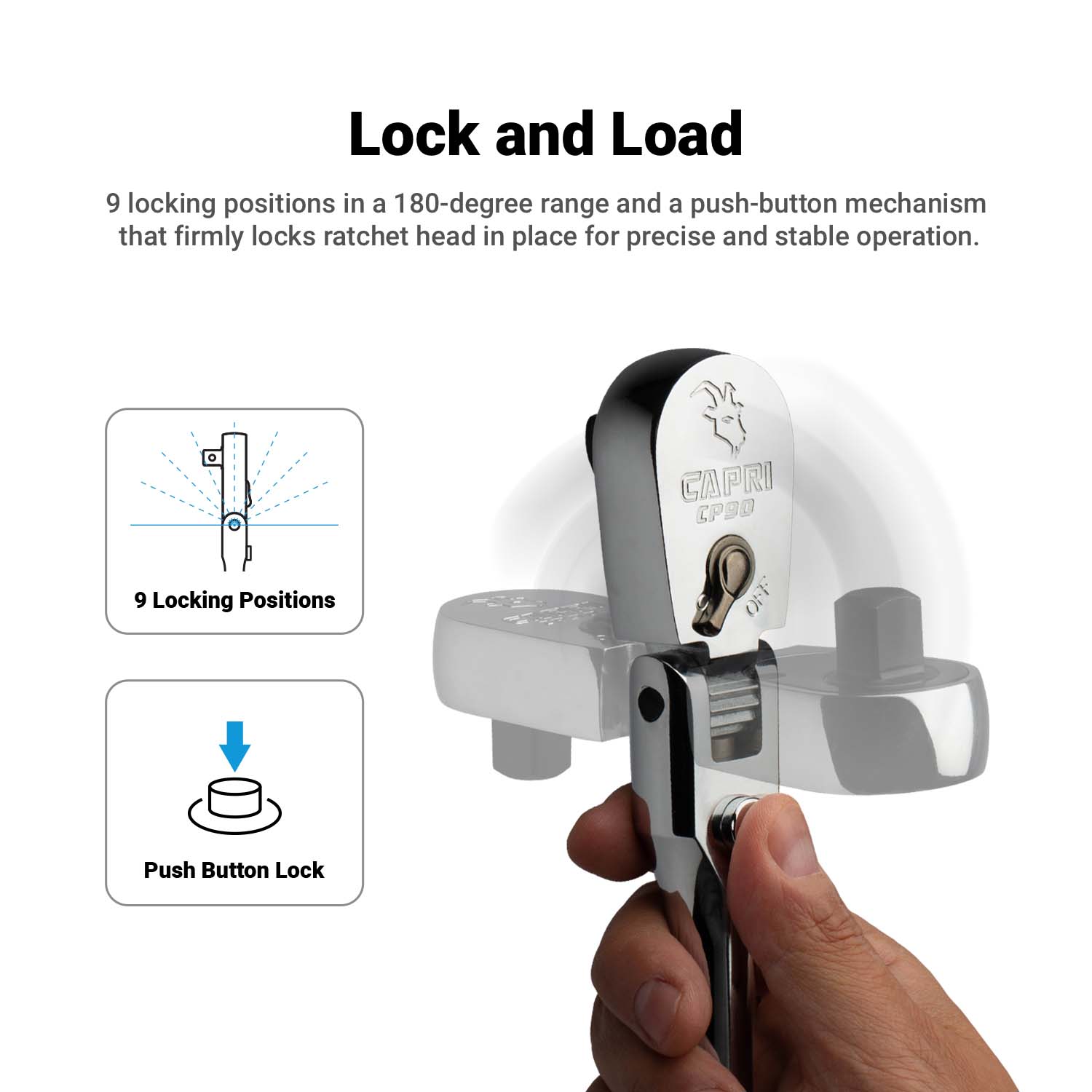 9 locking positions in a 180-degree range and a push-button mechanism that firmly locks ratchet head in place for precise and stable operation.