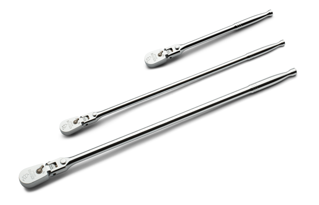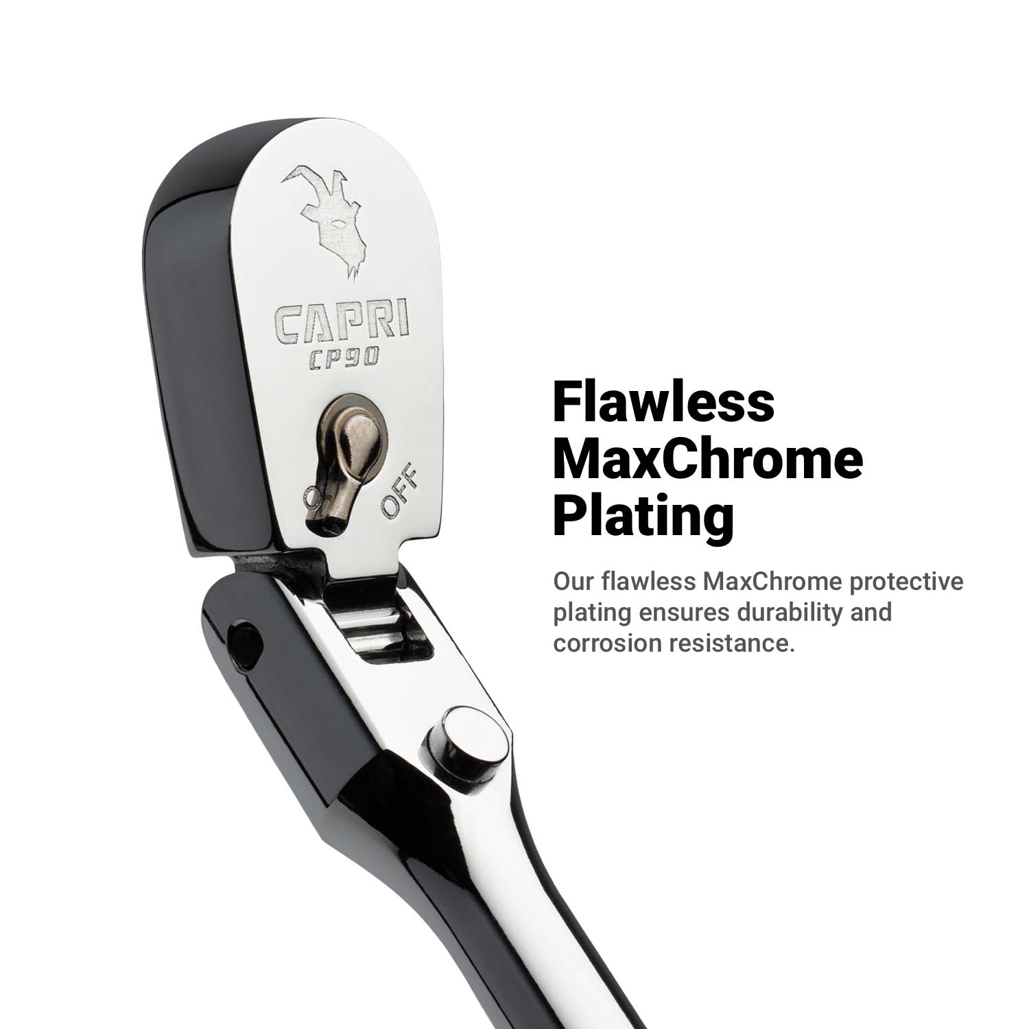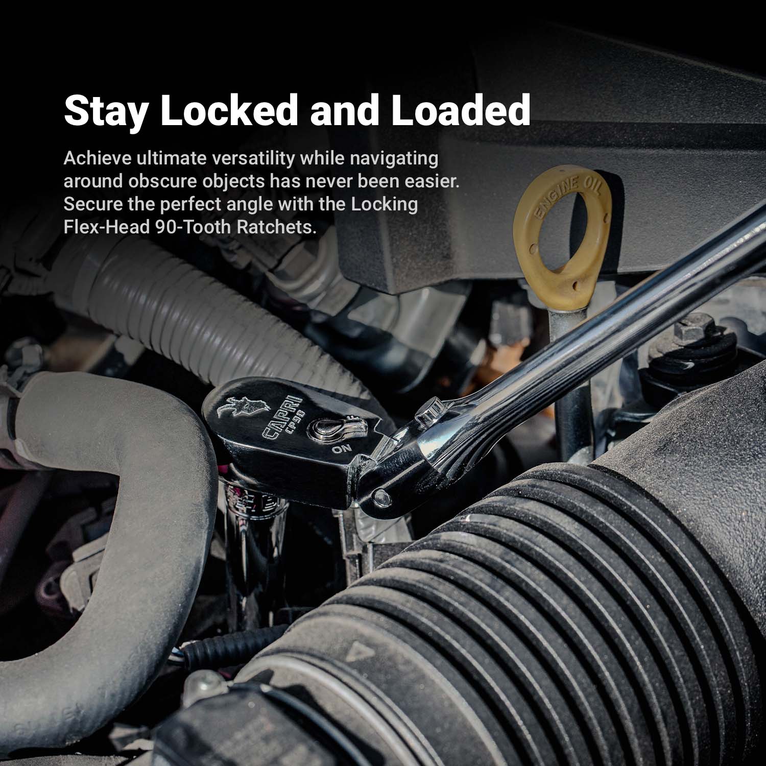 Locking flex-head extra long ratchets are the ultimate tool for flexibility, precision, and durability. Featuring a 9-point locking head for secure, customizable angles, these ratchets are equipped an extended-length design for superior leverage and reach. Anti-dust design seals out dusts and debris to protect the gear and maintain internal lubrication for sustained high performance over time. The low-profile ratchet head and 90-tooth fine gear mechanism with a 4-degree swing arc ensure smooth operation in tight spaces, while the true single-pawl gear design and dual-direction ratcheting provide reliable performance. Finished with flawless MaxChrome plating for durability and corrosion resistance, this ratchet is built to deliver flawless results in any project.
