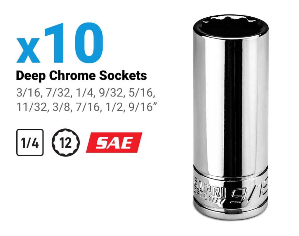 | CP16101-20SSD | 1/4″ 12-Point Master Chrome Sockets Set, 3/16 - 9/16", SAE | 20 |