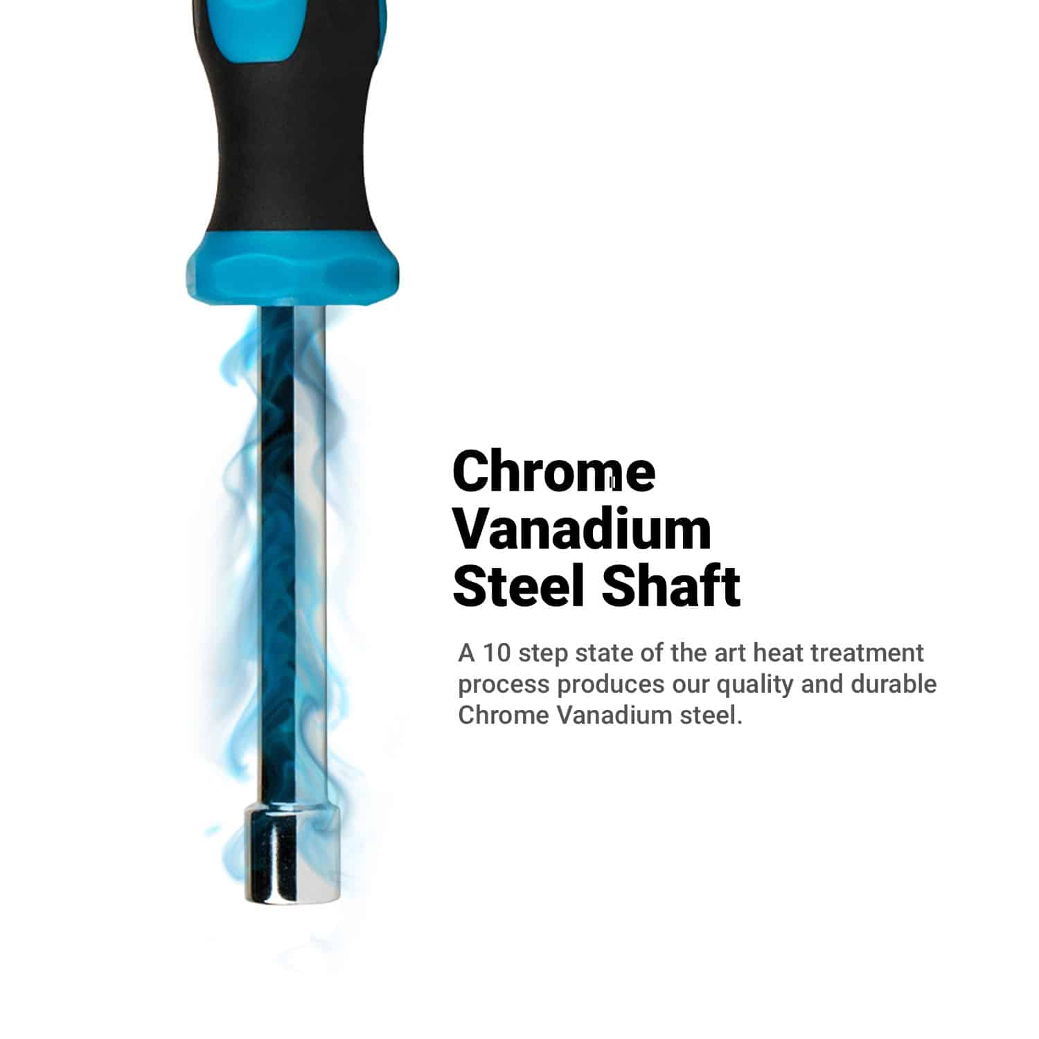 The Capri Tools Kontour™ Nut Drivers are forged from Chrome Vanadium steel to give you ultimate performance and durability. It is equipped with full length 3 in. long hollow shaft which works perfectly on both regular and long bolts. The Kontour™ handle is shaped to fit the curvature of you hand, giving you a powerful and ultra-comfortable grip. The Kontour™ handle is covered in alternating soft and hard layers, in a hybrid pattern designed to strike the perfect balance between high speed turning and high torque transfer, giving you a sure grip while letting you quickly shift in between turns. Anti-toll design helps the driver stay where you leave it and won’t roll away. Hanging hole at the top the handle lets you use standard hooks for organization and storage.