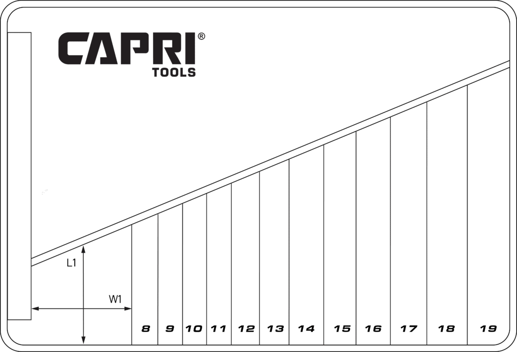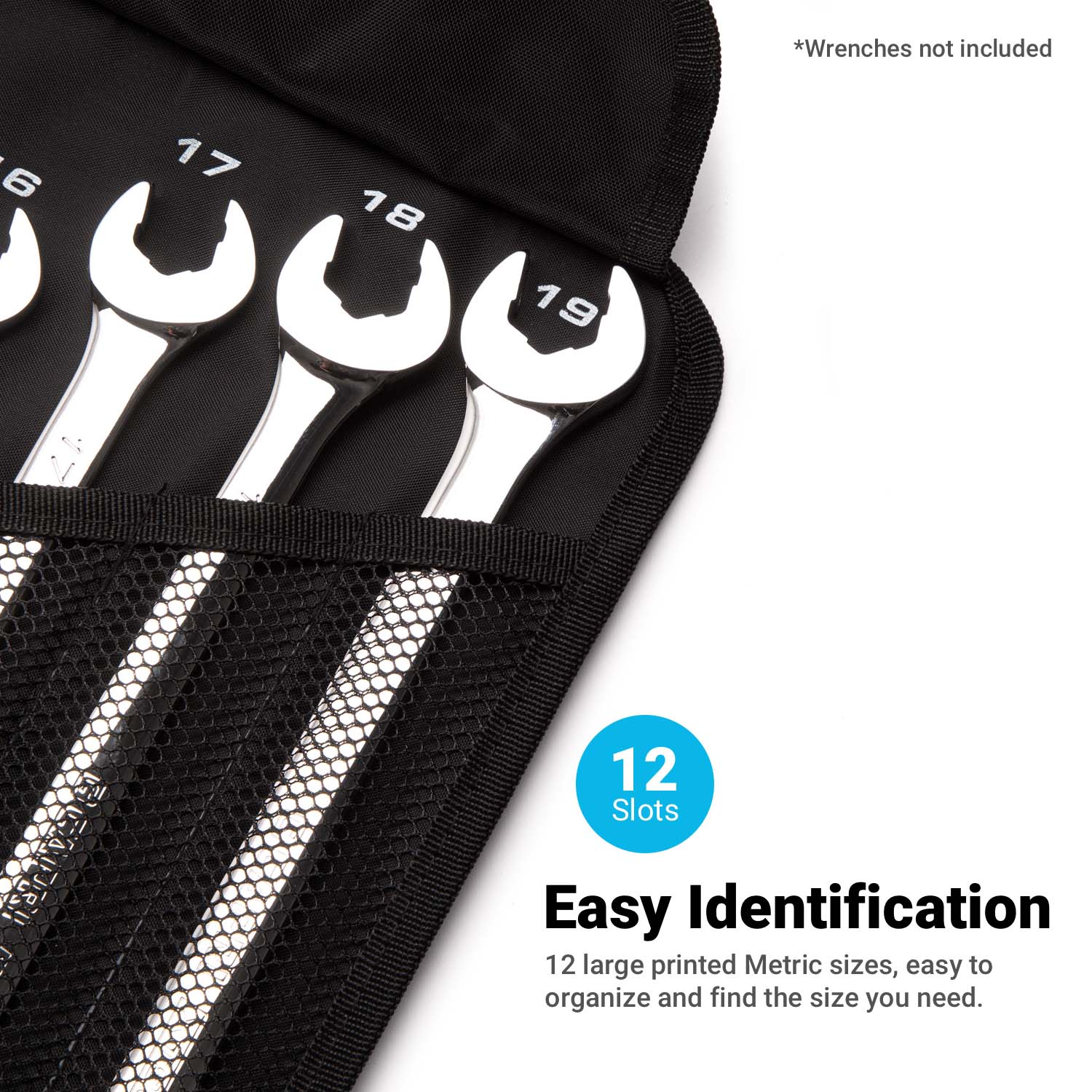 The Capri Tools heavy duty canvas roll-up wrench organizer pouch is made to help make carrying and organizing your favorite wrenches a breeze. Made with heavy duty polyester canvas, the pouch is long lasting, water resistant and does not retain moisture. The organizer pouch comes with 12 pockets for Metric, marked with sizes. Premium Velcro enclosure lets you open and close the pouch quickly, and it secures the content when the pouch is closed. The pouch is compact and easy to carry both when it’s rolled up or laid flat. 2 top hanging grommets let you easily hang the unrolled pouch for quick access.