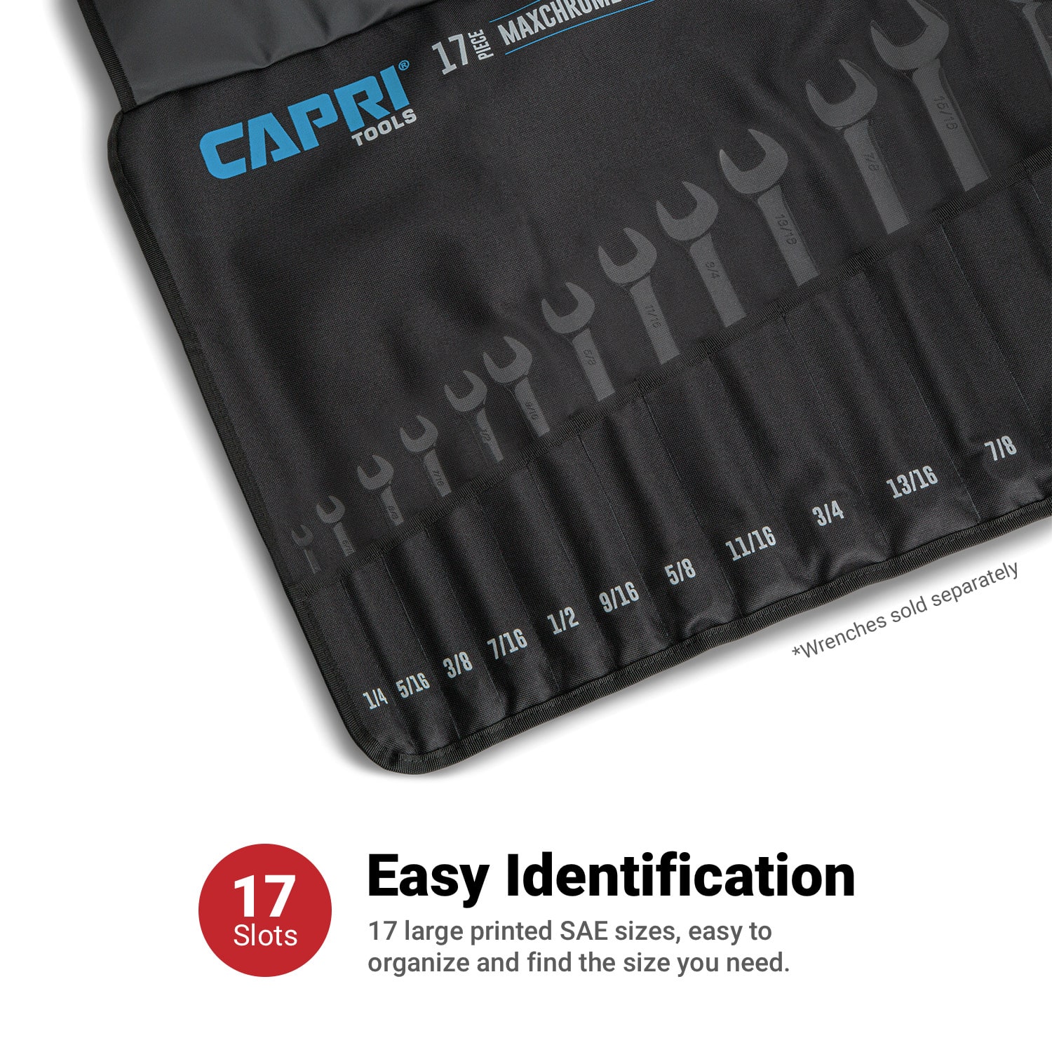 • Premium heavy duty canvas roll-up wrench organizer with 17 pockets for SAE sizes.