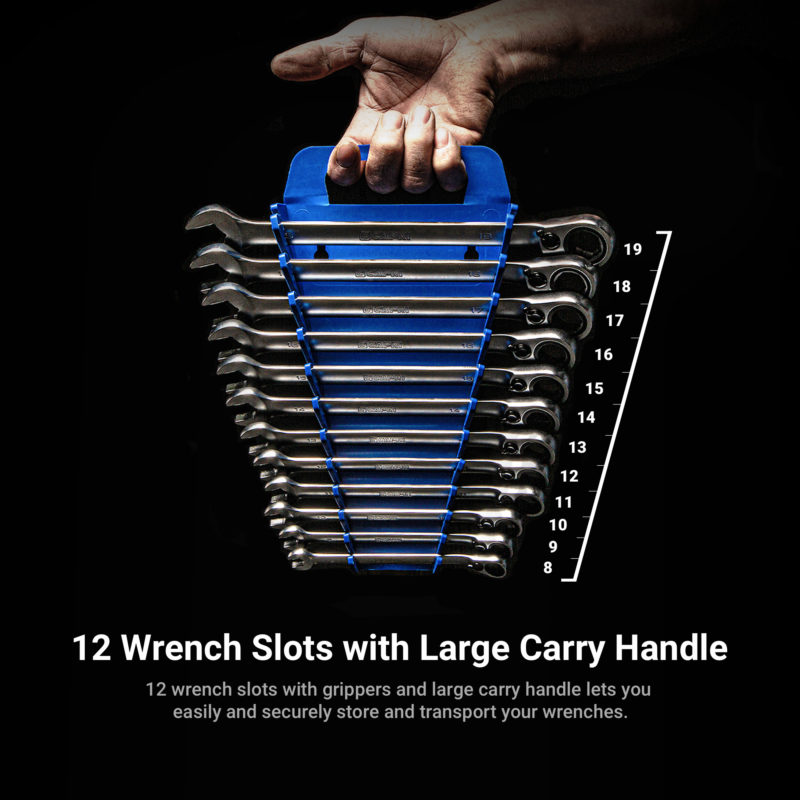 12 wrench slots with grippers and large carry handle lets you easily and securely store and transport your wrenches.